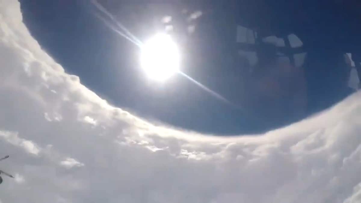 Máy bay xuyên qua bức tường mắt bão dày đặc mây cuồn cuộn. Gió giật hơn 250 km/h, mưa xối xả, máy bay rung lắc dữ dội. Phi hành đoàn vẫn bình tĩnh báo cáo dữ liệu. Chỉ vài phút sau, mọi thứ đột ngột im lặng. Bầu trời trong xanh bất ngờ hiện ra. Ánh nắng chiếu rọi như giữa ngày hè. Mây trắng tròn trịa bao quanh như sân vận động khổng lồ. Bầu không khí tĩnh lặng đến mức nghe rõ tiếng động cơ.